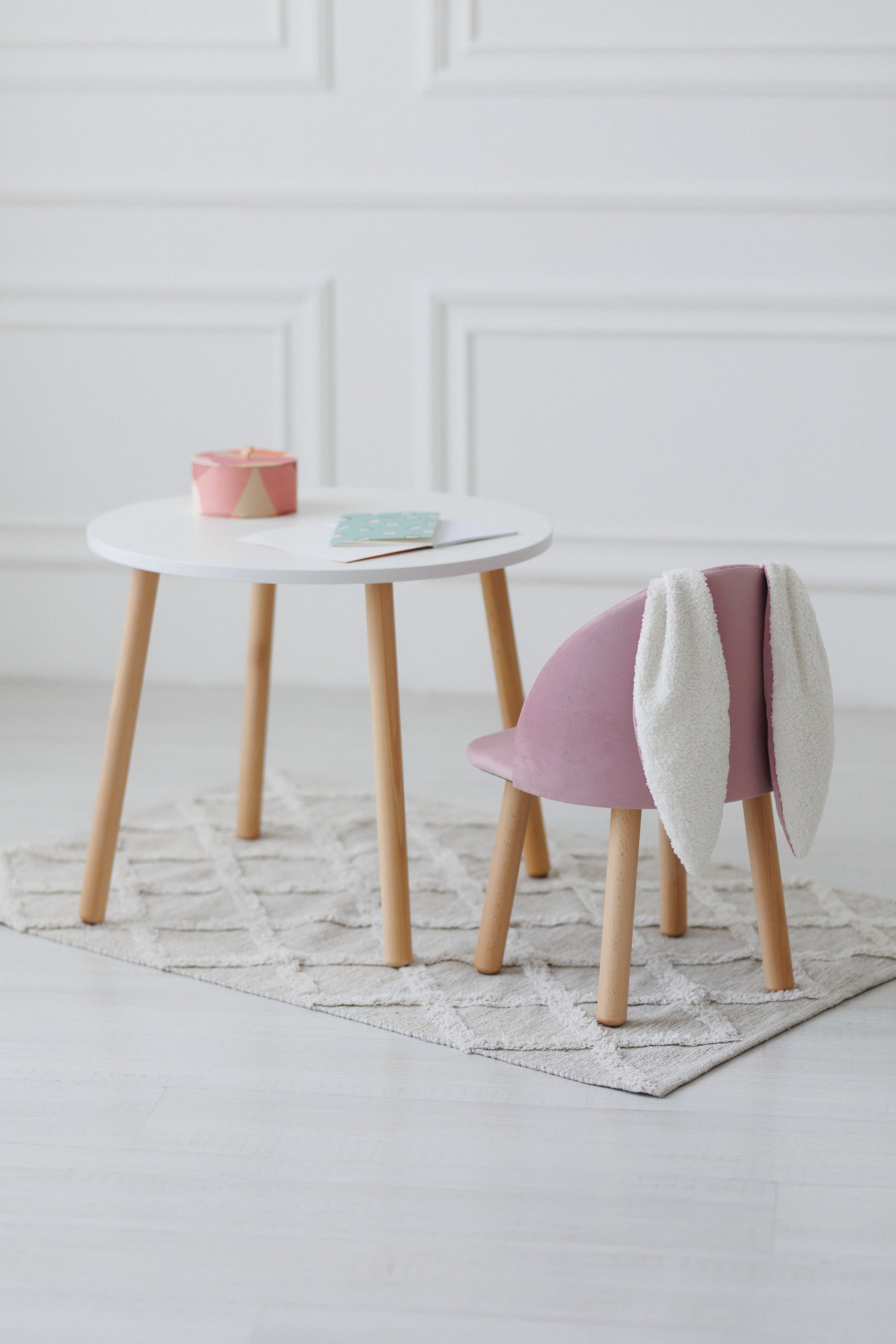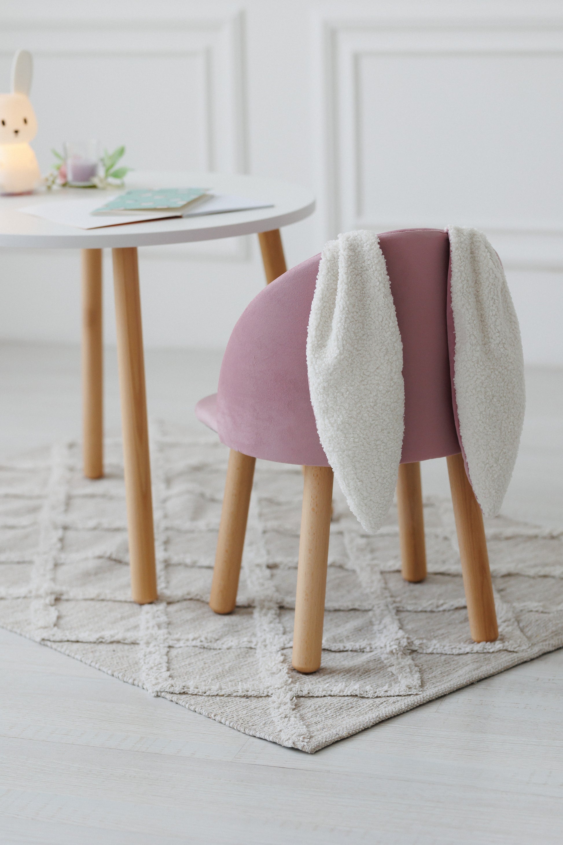 Bajkowy zestaw mebli, który zachwyca od pierwszego wejrzenia! Miękki fotelik z dekoracyjnymi uszami królika oraz minimalistyczny okrągły stolik — to idealne połączenie pięknego designu i wygody dla Twojego malucha.